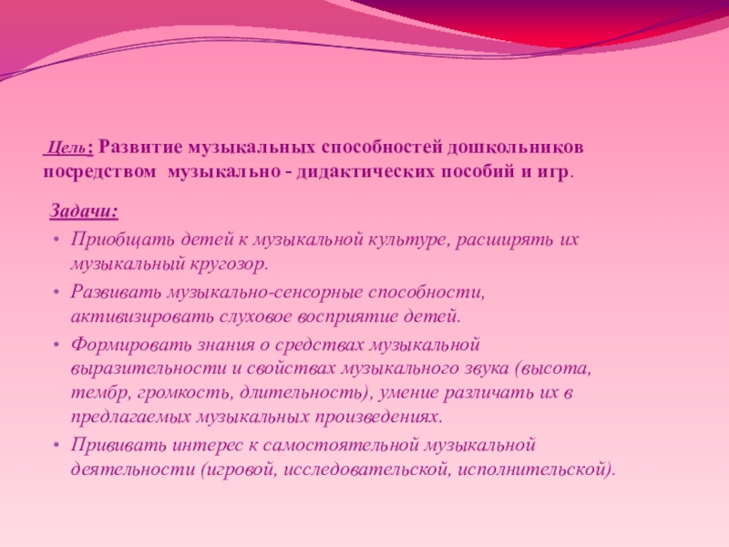 Формировать знания о средствах музыкальной выразительности и свойствах музыкального звука (высота, тембр, громкость, длительность), умение различать их в предлагаемых музыкальных произведениях.