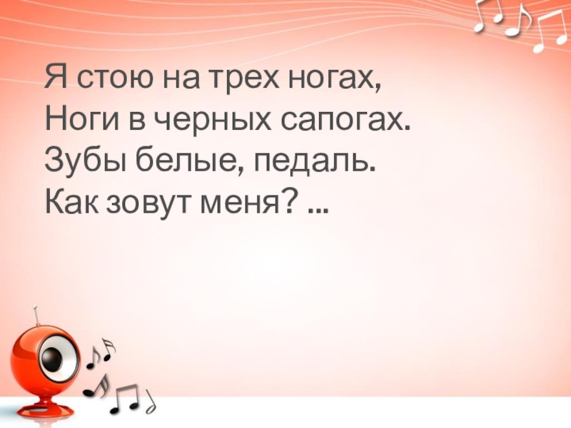 Я стою на трех ногах, Ноги в черных сапогах. Зубы белые, педаль. Как зовут меня? ...