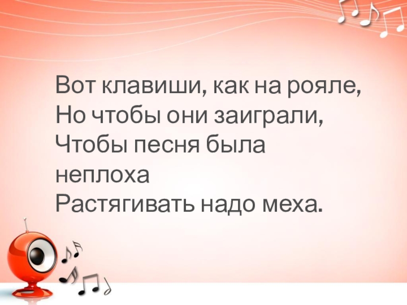 Вот клавиши, как на рояле,Но чтобы они заиграли,Чтобы песня была неплохаРастягивать надо меха.