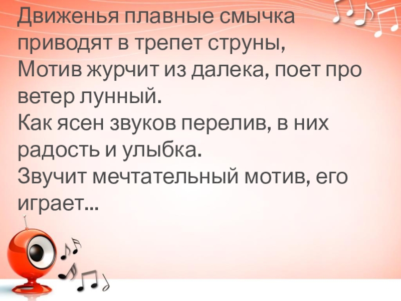 Слайд 22Движенья плавные смычка приводят в трепет струны,