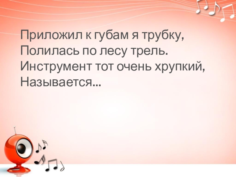 Приложил к губам я трубку,Полилась по лесу трель.Инструмент тот очень хрупкий,Называется...