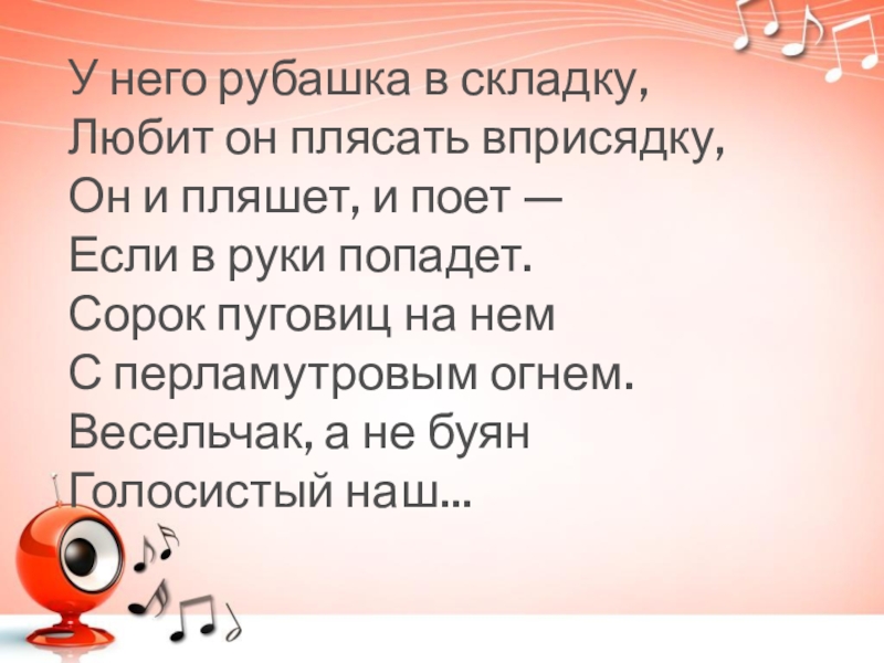 У него рубашка в складку, Любит он плясать вприсядку, Он и пляшет, и поет —Если в руки