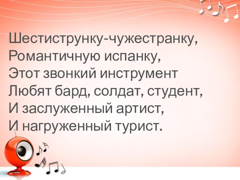 Шестиструнку-чужестранку, Романтичную испанку,Этот звонкий инструмент Любят бард, солдат, студент, И заслуженный артист,И нагруженный турист.