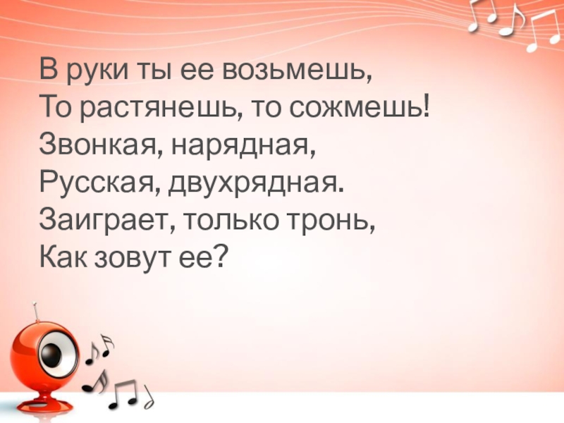 В руки ты ее возьмешь, То растянешь, то сожмешь! Звонкая, нарядная, Русская, двухрядная. Заиграет, только тронь, Как