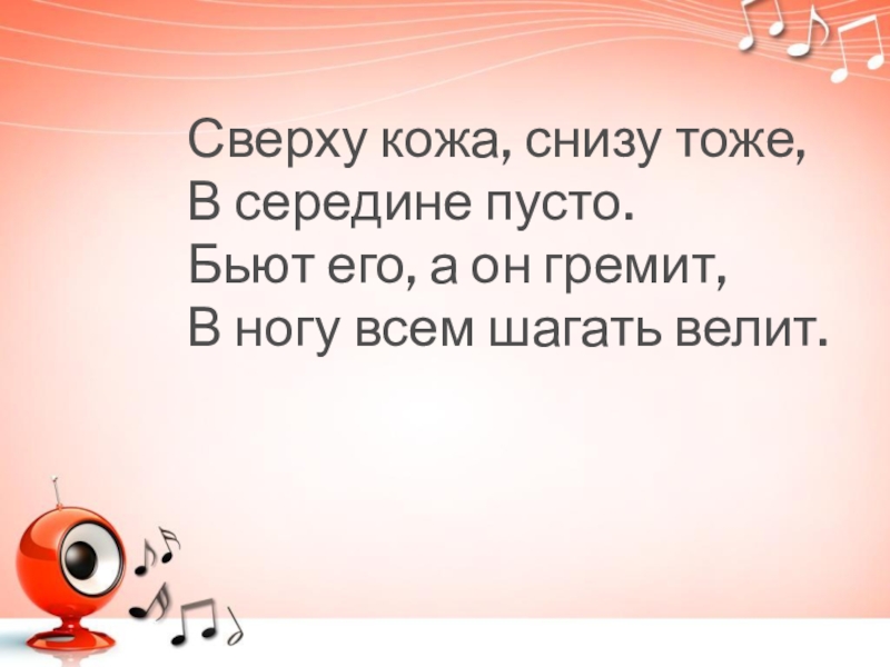 Сверху кожа, снизу тоже,В середине пусто.Бьют его, а он гремит,В ногу всем шагать велит.