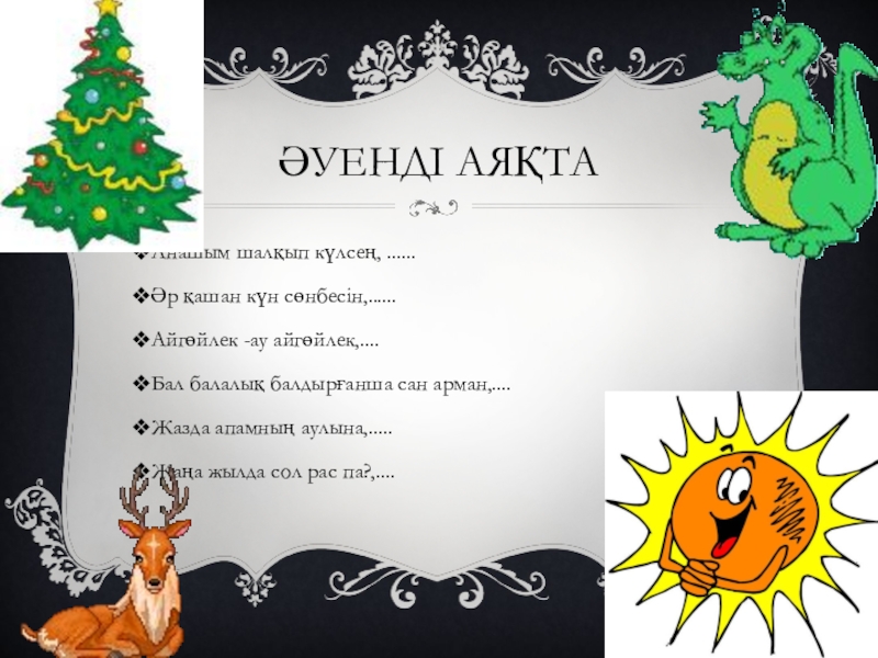 Әуенді аяқтаАнашым шалқып күлсең, ......Әр қашан күн сөнбесін,......Айгөйлек -ау айгөйлек,....Бал балалық балдырғанша сан арман,....Жазда апамның аулына,.....Жаңа жылда
