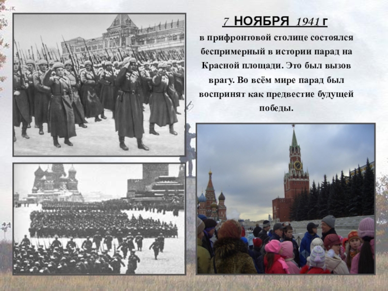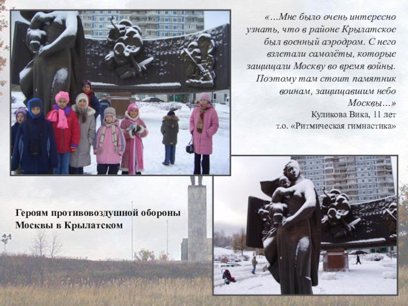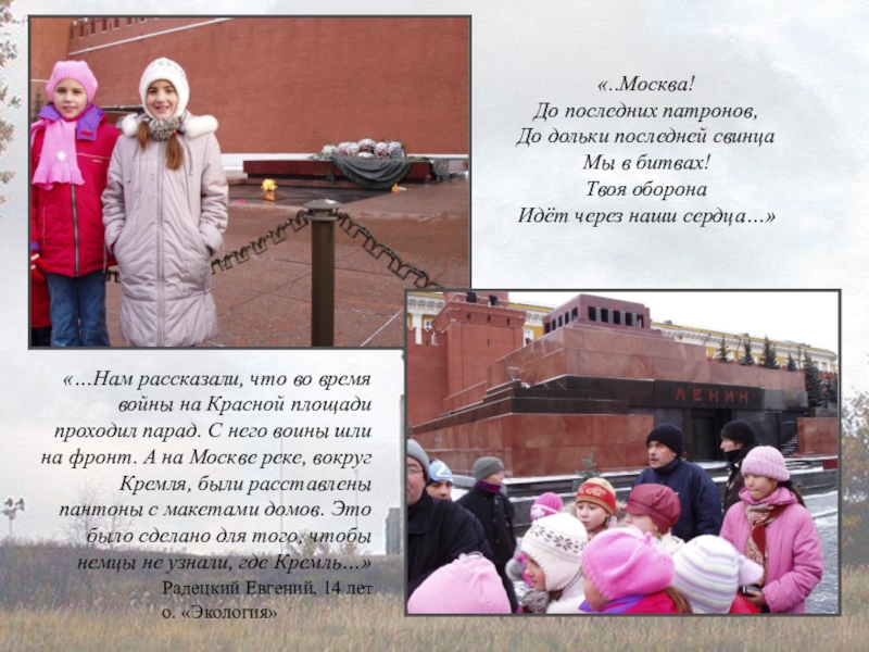 «…Нам рассказали, что во время войны на Красной площади проходил парад. С него воины шли на фронт. А на Москве реке, вокруг Кремля, были расставлены пантоны с макетами домов. Это было сделано для того, чтобы немцы не узнали, где Кремль…»