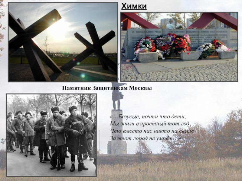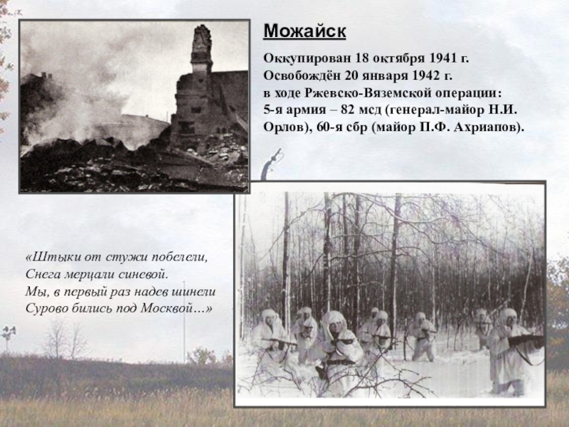 «Штыки от стужи побелели, Снега мерцали синевой. Мы, в первый раз надев шинели Сурово бились под Москвой…»