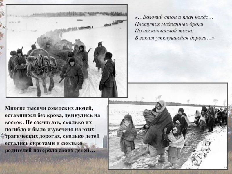 Многие тысячи советских людей, оставшихся без крова, двинулись на восток. Не сосчитать, сколько их погибло и было изувечено на этих трагических дорогах, сколько детей остались сиротами и сколько родителей потеряло своих детей…