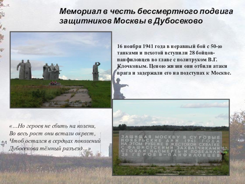 «…Но героев не сбить на колени, Во весь рост они встали окрест, Чтоб остался в сердцах поколений Дубосекова тёмный разъезд…»