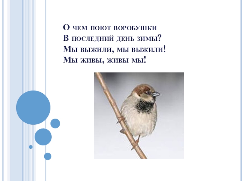 Слайд 8О чем поют воробушки В последний день зимы? Мы выжили, мы выжили! Мы живы,