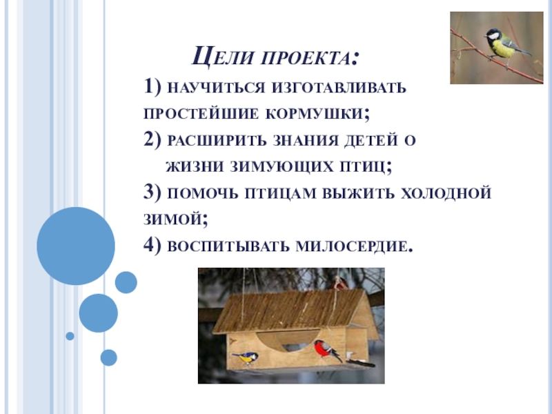 Цели проекта: 1) научиться изготавливать простейшие кормушки; 2) расширить знания детей о жизни зимующих птиц; 3) помочь птицам выжить холодной зимой; 4) воспитывать милосердие.