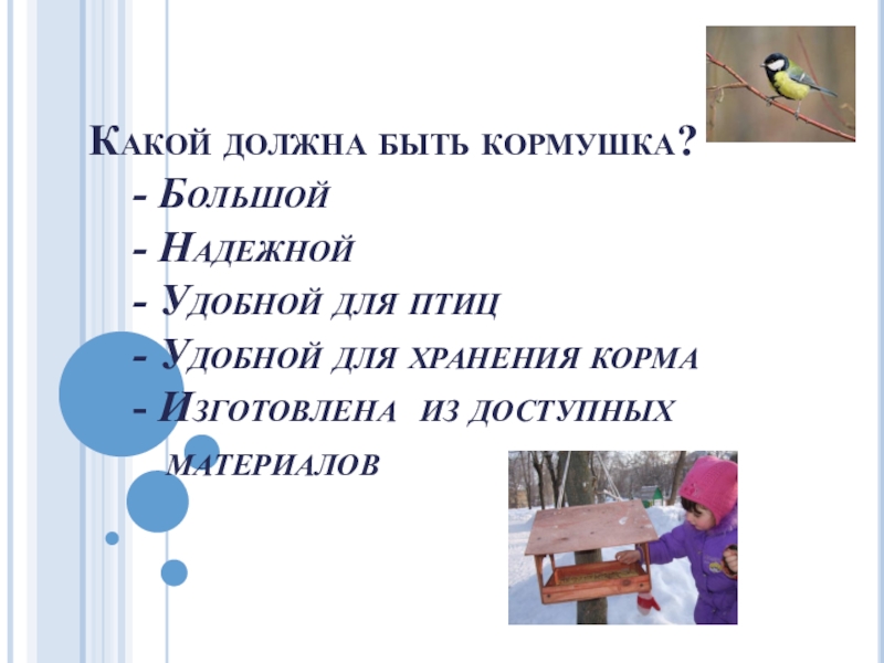 Слайд 4Какой должна быть кормушка? - Большой - Надежной