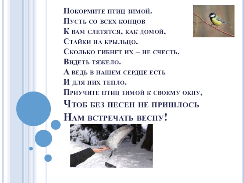 Слайд 11Покормите птиц зимой. Пусть со всех концов К вам слетятся, как домой, Стайки на