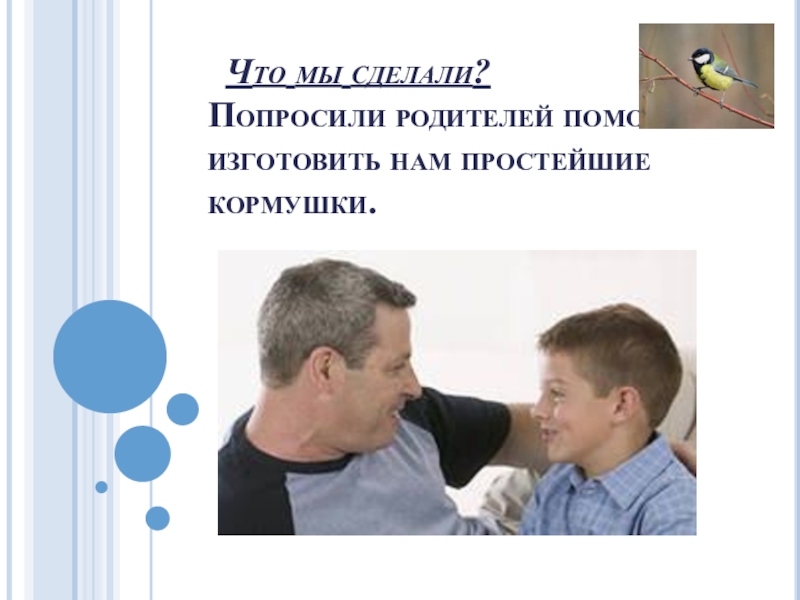 Слайд 3 Что мы сделали? Попросили родителей помочь изготовить нам простейшие кормушки.