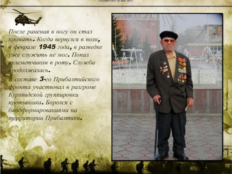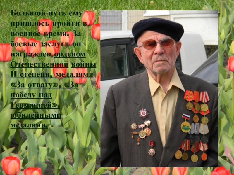 Слайд 11Большой путь ему пришлось пройти в военное время. За боевые заслуги