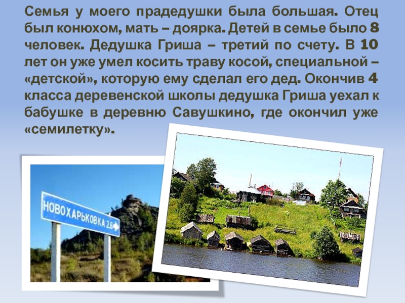 доярка. Детей в семье было 8 человек. Дедушка Гриша – третий по счету. В 10 лет он уже умел косить траву косой, специальной – «детской», которую ему сделал его дед. Окончив 4 класса деревенской школы дедушка Гриша уехал к бабушке в деревню Савушкино, где окончил уже «семилетку».