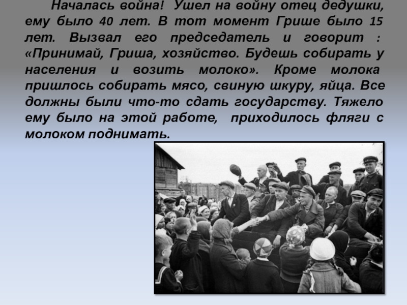 было 40 лет. В тот момент Грише было 15 лет. Вызвал его председатель и говорит : «Принимай, Гриша, хозяйство. Будешь собирать у населения и возить молоко». Кроме молока пришлось собирать мясо, свиную шкуру, яйца. Все должны были что-то сдать государству. Тяжело ему было на этой работе, приходилось фляги с молоком поднимать.