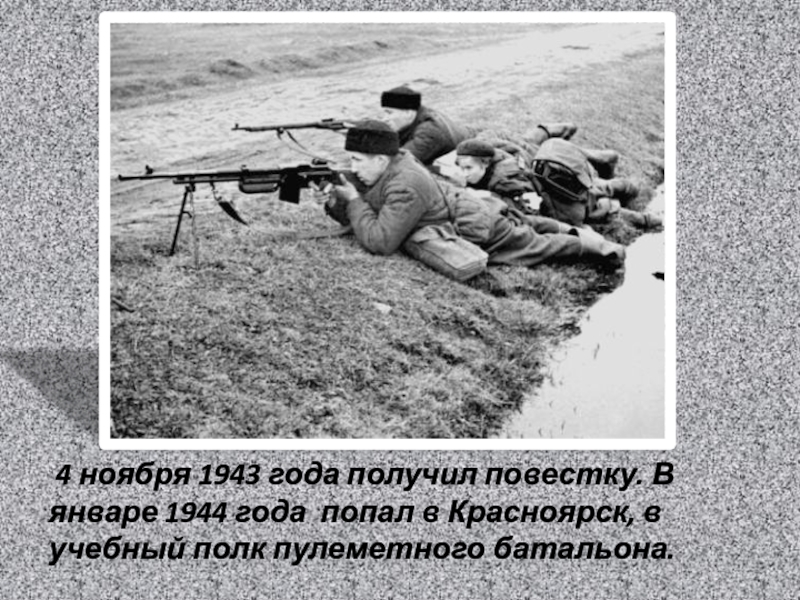 Слайд 5 4 ноября 1943 года получил повестку. В январе 1944 года