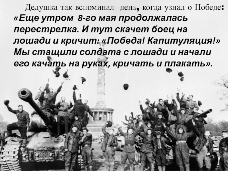 Слайд 9 Дедушка так вспоминал день, когда узнал о Победе: «Еще