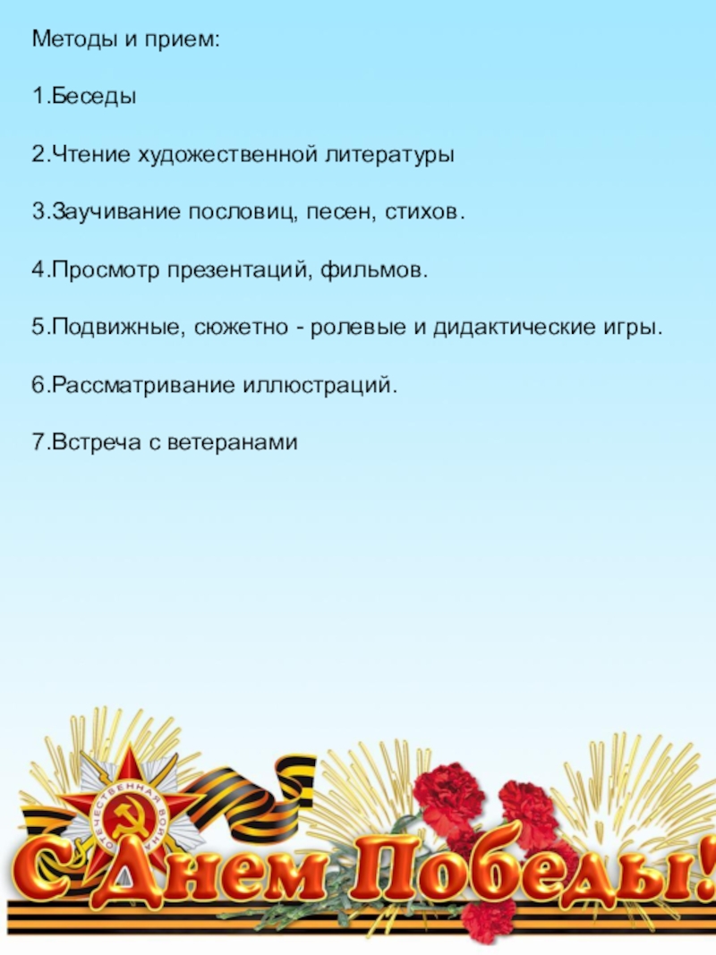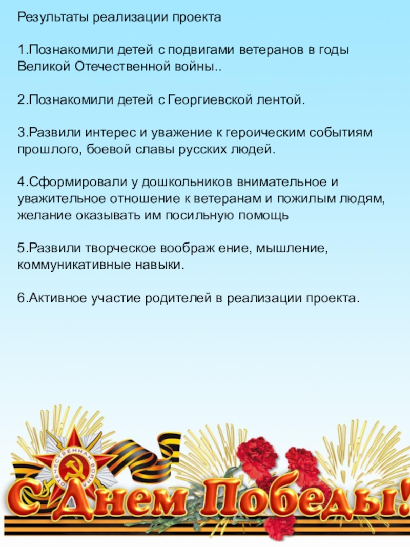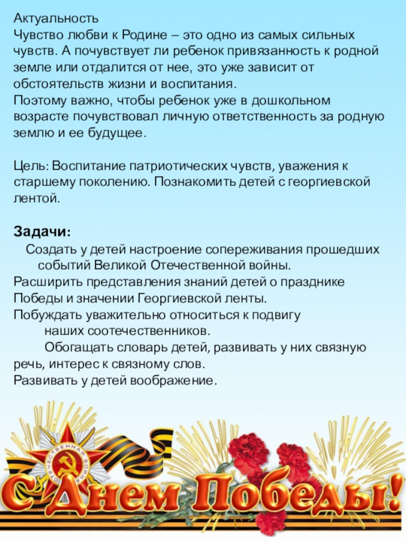 Расширить представления знаний детей о празднике Победы и значении Георгиевской ленты.