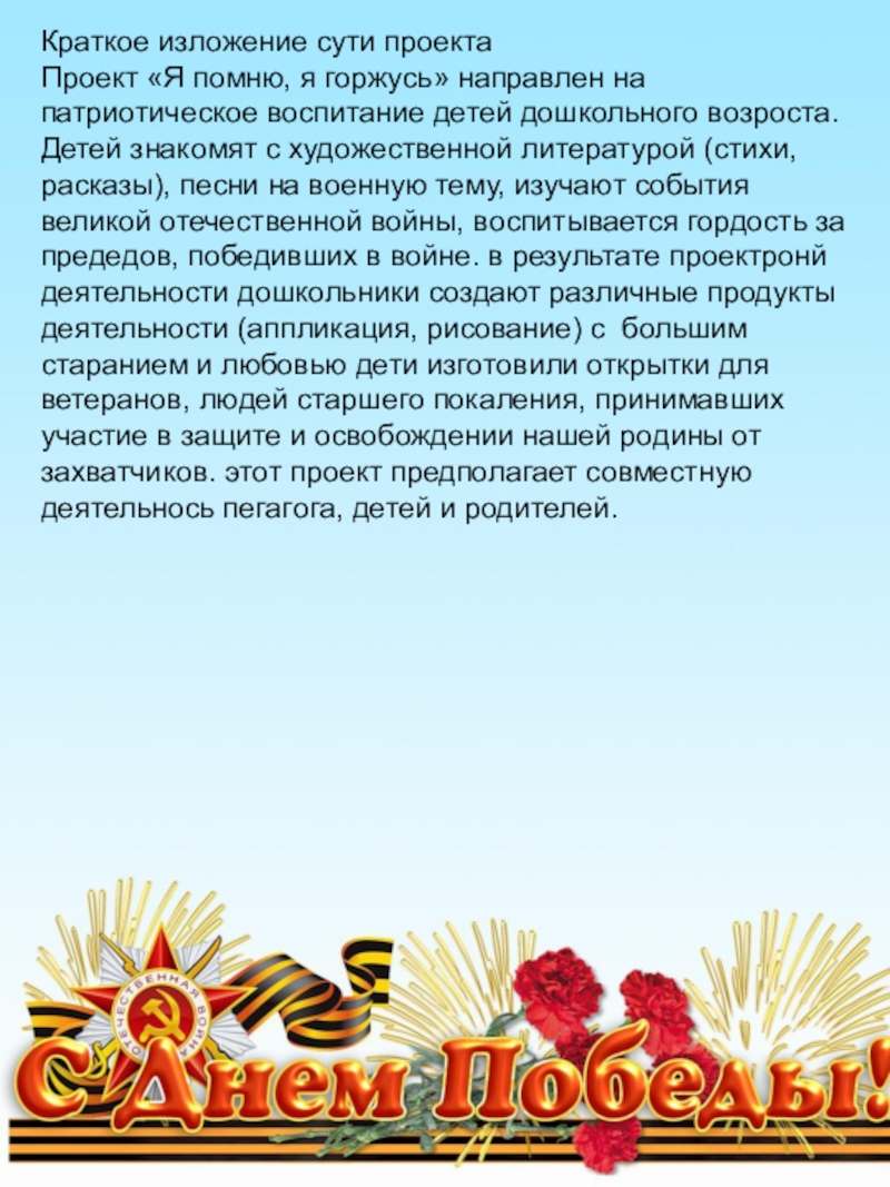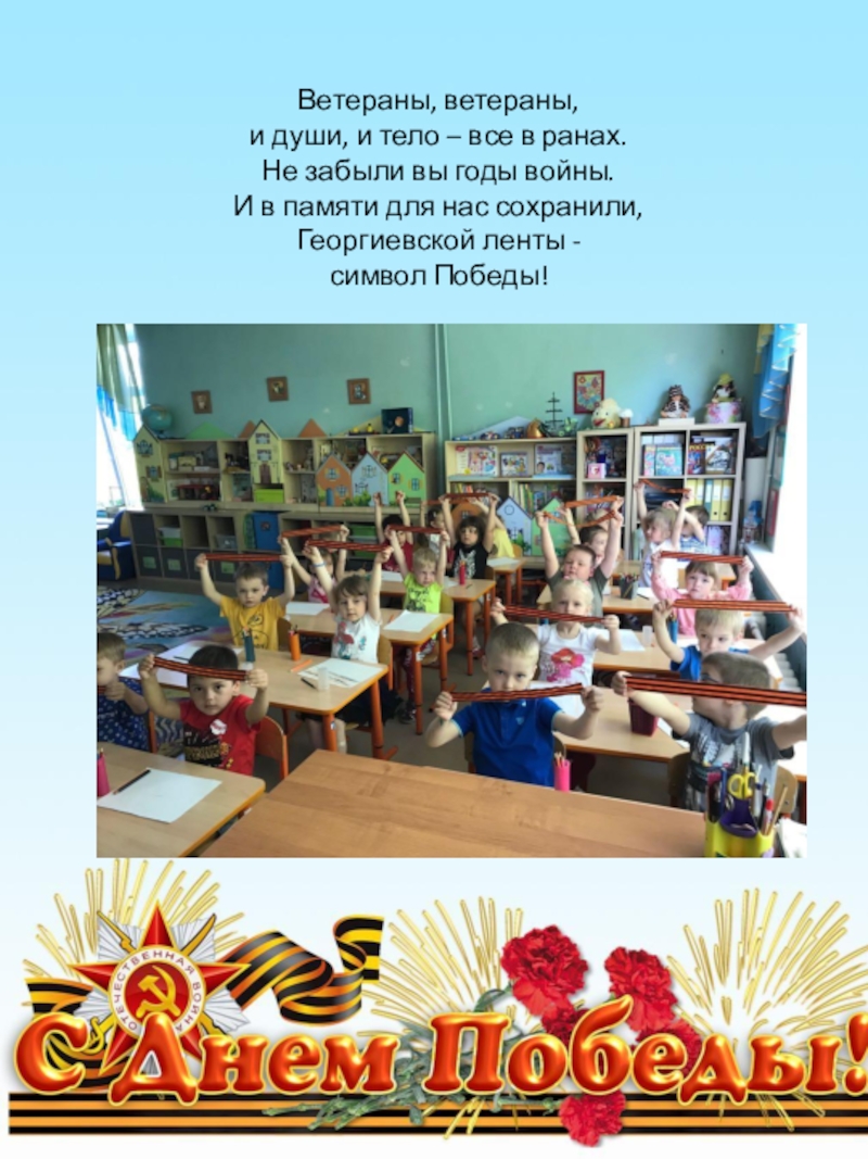 Цель: Воспитание патриотических чувств, уважения к старшему поколению. Познакомить детей с георгиевской лентой.