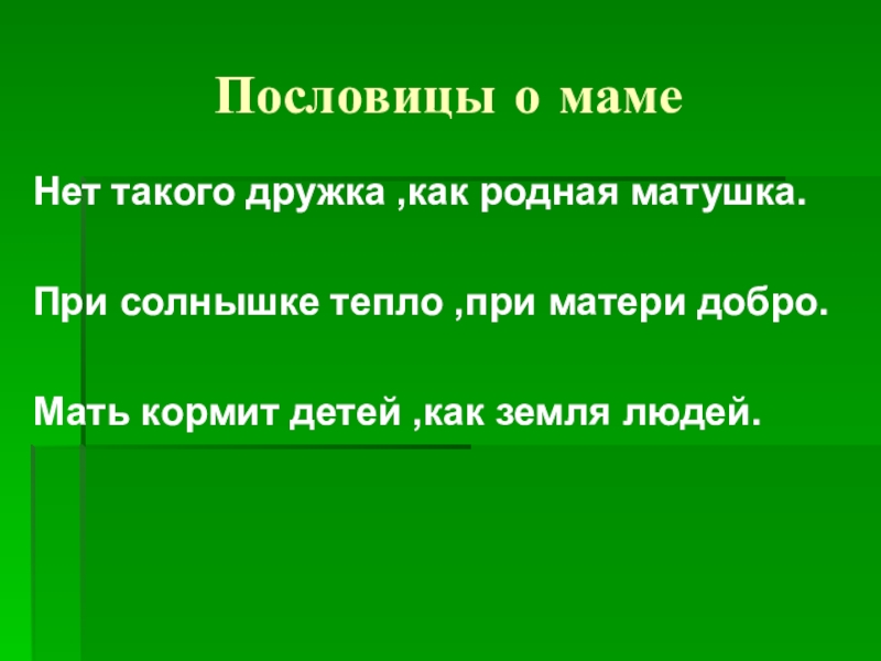 Пословицы о мамеНет такого дружка ,как родная матушка.При солнышке тепло ,при матери добро.Мать кормит детей ,как земля