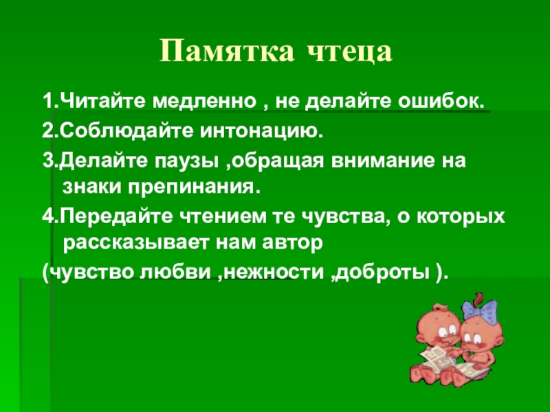 Памятка чтеца1.Читайте медленно , не делайте ошибок.2.Соблюдайте интонацию.3.Делайте паузы ,обращая внимание на знаки препинания.4.Передайте чтением те чувства,
