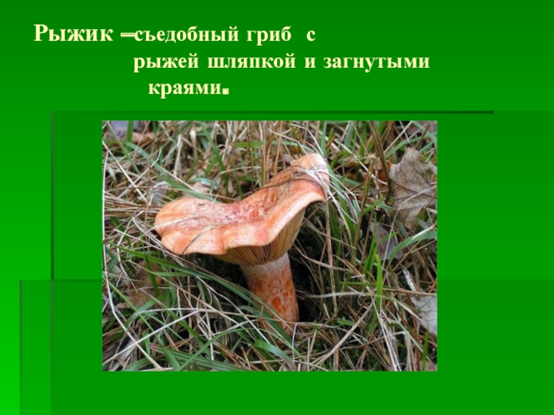 Рыжик –съедобный гриб с        рыжей шляпкой и загнутыми