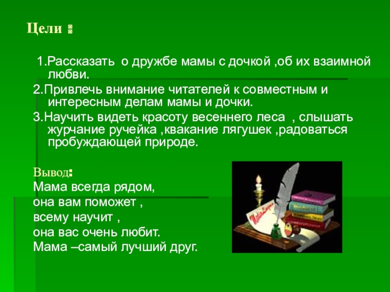 Цели : 1.Рассказать о дружбе мамы с дочкой ,об их взаимной любви.2.Привлечь внимание читателей к совместным и