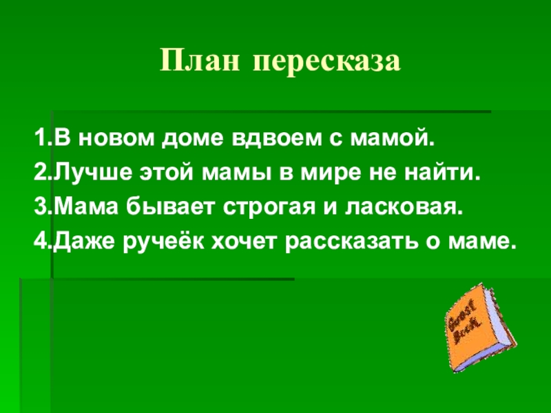 План пересказа1.В новом доме вдвоем с мамой.2.Лучше этой мамы в мире не найти.3.Мама бывает строгая и ласковая.4.Даже