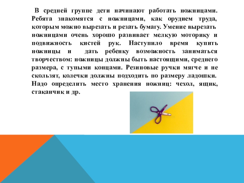 Слайд 2 В средней группе дети начинают работать ножницами. Ребята знакомятся с ножницами,