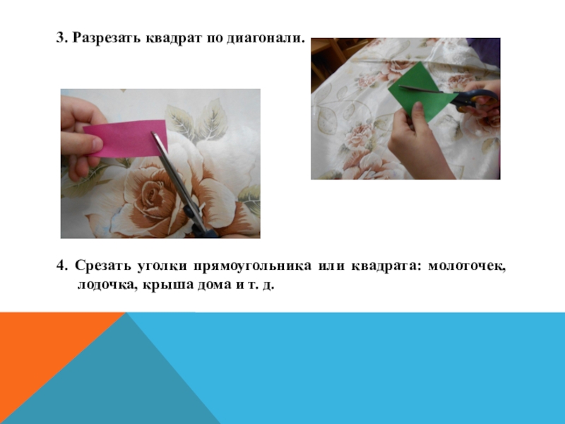 3. Разрезать квадрат по диагонали.4. Срезать уголки прямоугольника или квадрата: молоточек, лодочка, крыша дома и т. д.