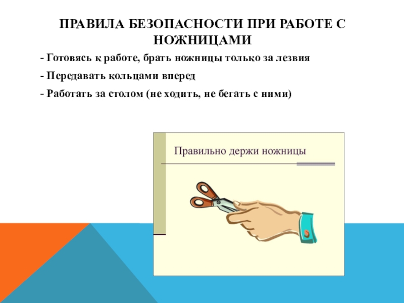 Правила безопасности при работе с ножницами- Готовясь к работе, брать ножницы только за лезвия- Передавать кольцами вперед-