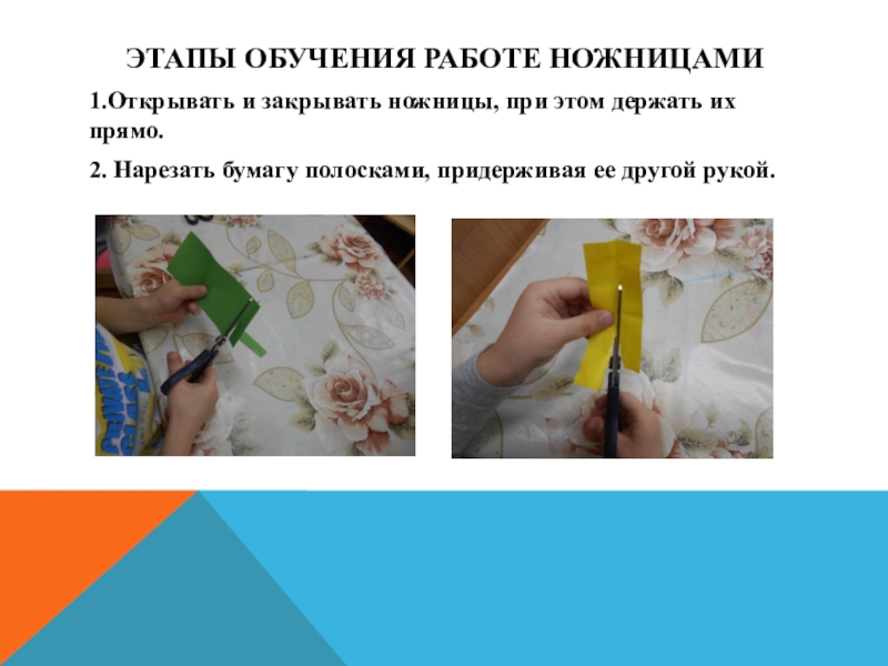 Этапы обучения работе ножницами1.Открывать и закрывать ножницы, при этом держать их прямо.2. Нарезать бумагу полосками, придерживая ее