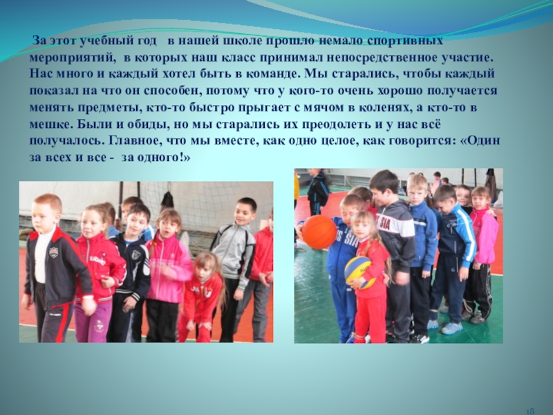 спортивных мероприятий, в которых наш класс принимал непосредственное участие. Нас много и каждый хотел быть в команде. Мы старались, чтобы каждый показал на что он способен, потому что у кого-то очень хорошо получается менять предметы, кто-то быстро прыгает с мячом в коленях, а кто-то в мешке. Были и обиды, но мы старались их преодолеть и у нас всё получалось. Главное, что мы вместе, как одно целое, как говорится: «Один за всех и все - за одного!»
