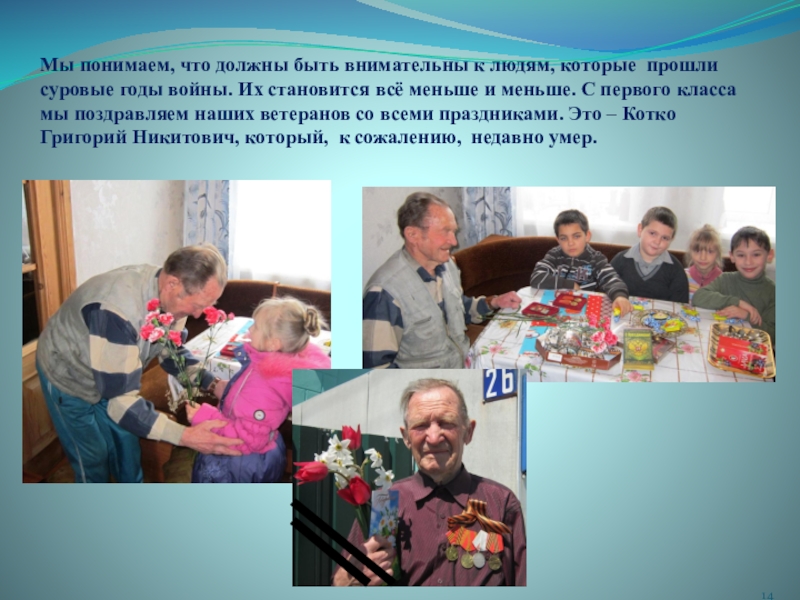 годы войны. Их становится всё меньше и меньше. С первого класса мы поздравляем наших ветеранов со всеми праздниками. Это – Котко Григорий Никитович, который, к сожалению, недавно умер.