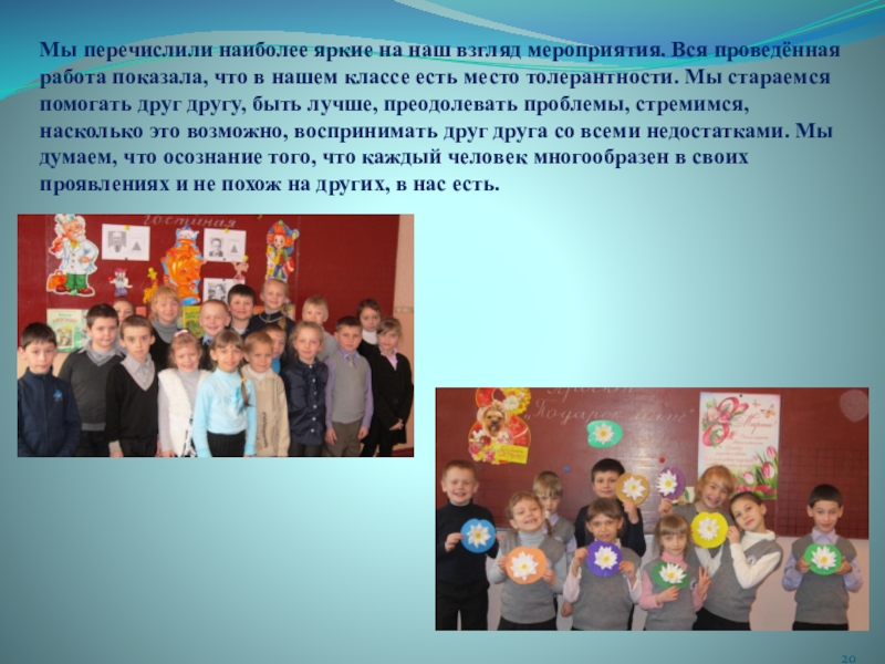 показала, что в нашем классе есть место толерантности. Мы стараемся помогать друг другу, быть лучше, преодолевать проблемы, стремимся, насколько это возможно, воспринимать друг друга со всеми недостатками. Мы думаем, что осознание того, что каждый человек многообразен в своих проявлениях и не похож на других, в нас есть.