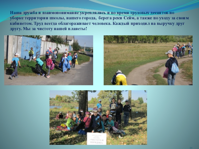 уборке территории школы, нашего города, берега реки Сейм, а также по уходу за своим кабинетом. Труд всегда облагораживает человека. Каждый приходил на выручку друг другу. Мы за чистоту нашей планеты!