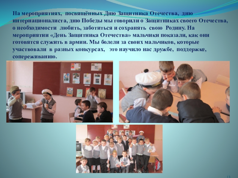 Слайд 13На мероприятиях, посвящённых Дню Защитника Отечества, дню интернационалиста, дню Победы мы