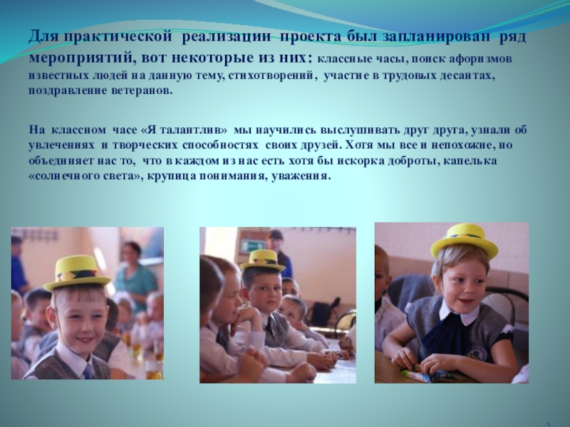 На классном часе «Я талантлив» мы научились выслушивать друг друга, узнали об увлечениях и творческих способностях своих друзей. Хотя мы все и непохожие, но объединяет нас то, что в каждом из нас есть хотя бы искорка доброты, капелька «солнечного света», крупица понимания, уважения.