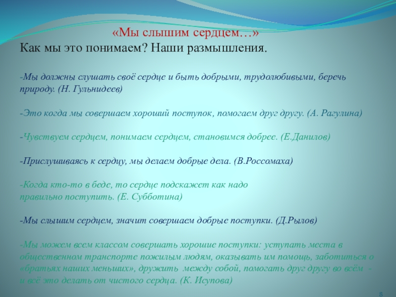 -Мы слышим сердцем, значит совершаем добрые поступки. (Д.Рылов)