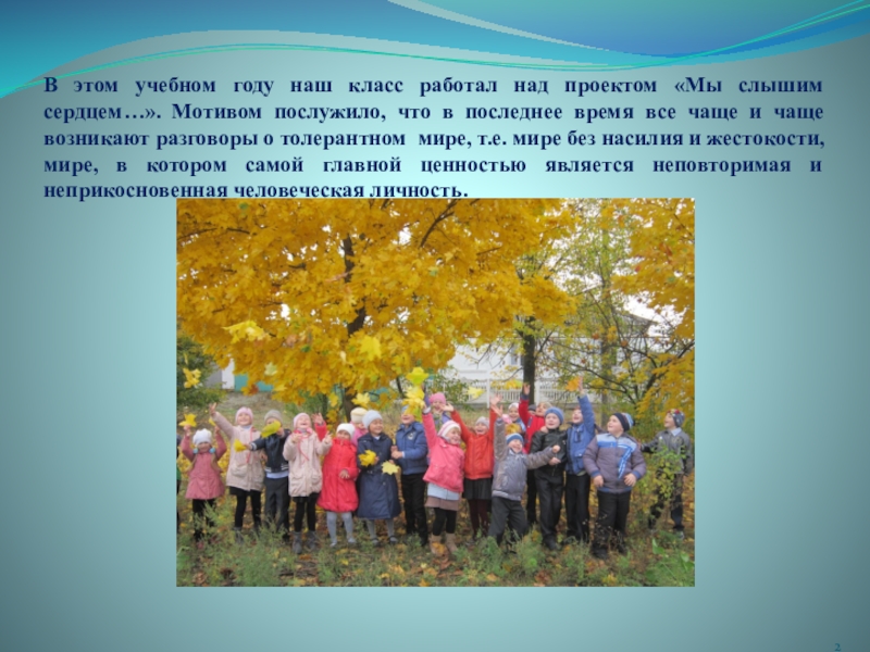 сердцем…». Мотивом послужило, что в последнее время все чаще и чаще возникают разговоры о толерантном мире, т.е. мире без насилия и жестокости, мире, в котором самой главной ценностью является неповторимая и неприкосновенная человеческая личность.