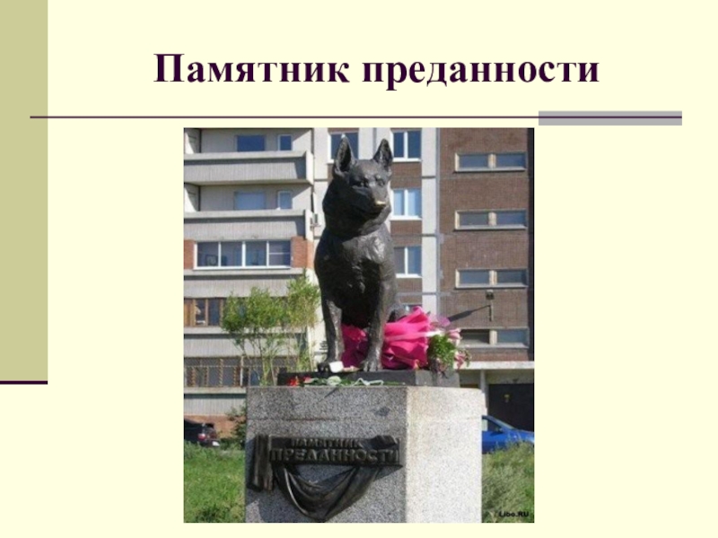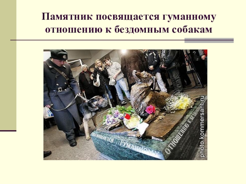 Слайд 35Памятник посвящается гуманному отношению к бездомным собакам