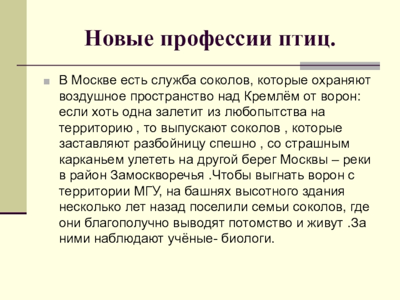 над Кремлём от ворон: если хоть одна залетит из любопытства на территорию , то выпускают соколов , которые заставляют разбойницу спешно , со страшным карканьем улететь на другой берег Москвы – реки в район Замоскворечья .Чтобы выгнать ворон с территории МГУ, на башнях высотного здания несколько лет назад поселили семьи соколов, где они благополучно выводят потомство и живут .За ними наблюдают учёные- биологи.