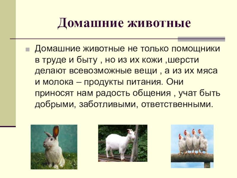 но из их кожи ,шерсти делают всевозможные вещи , а из их мяса и молока – продукты питания. Они приносят нам радость общения , учат быть добрыми, заботливыми, ответственными.