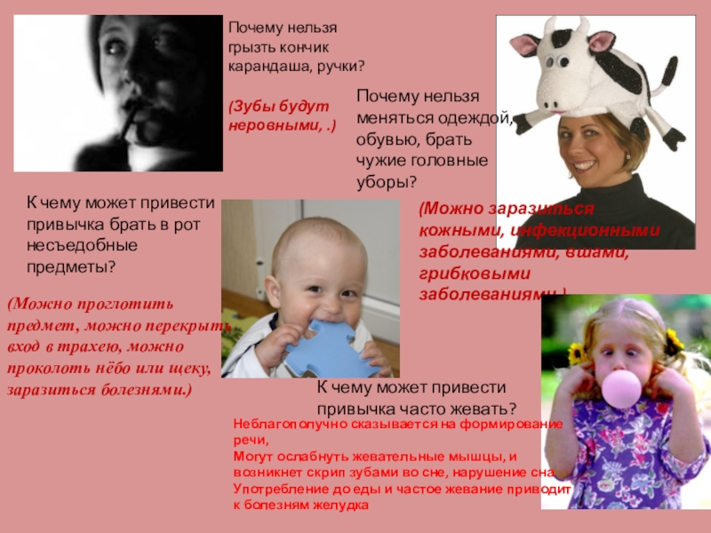 (Можно проглотить предмет, можно перекрыть вход в трахею, можно проколоть нёбо или щеку, заразиться болезнями.)