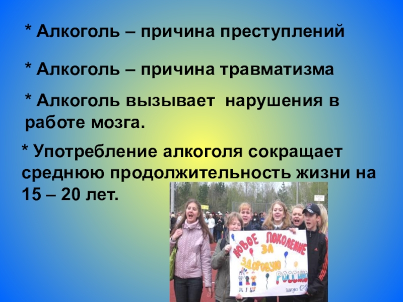 * Употребление алкоголя сокращает среднюю продолжительность жизни на 15 – 20 лет.