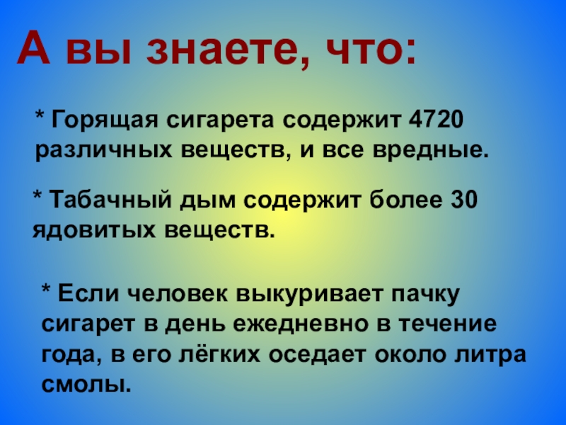 * Табачный дым содержит более 30 ядовитых веществ.