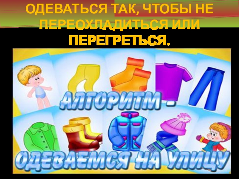 Слайд 13НА ПРОГУЛКУ НАДО ОДЕВАТЬСЯ ТАК, ЧТОБЫ НЕ ПЕРЕОХЛАДИТЬСЯ ИЛИ ПЕРЕГРЕТЬСЯ.